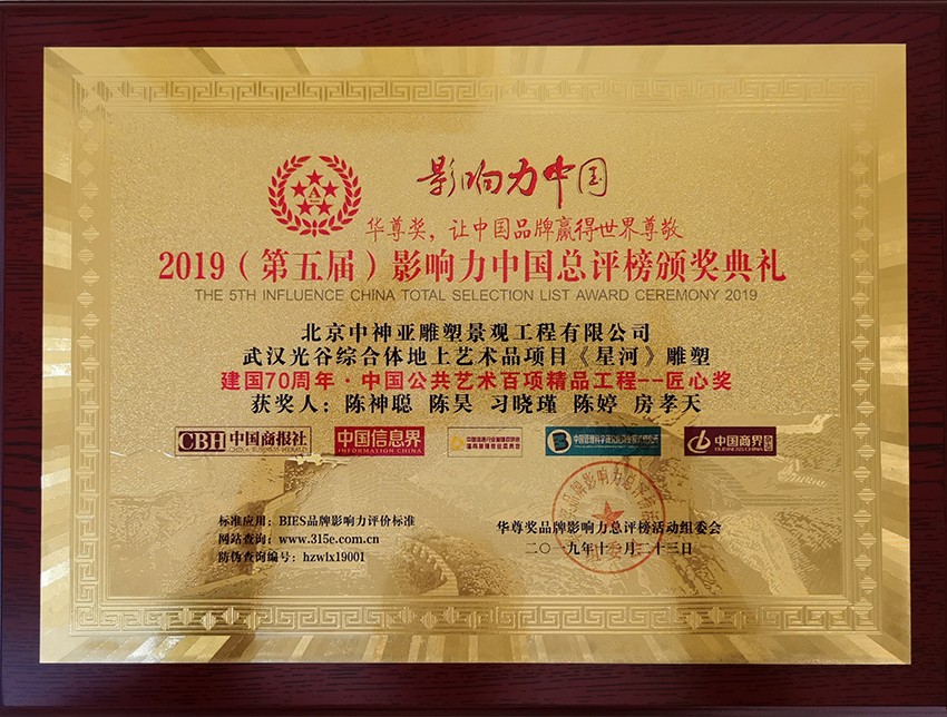 中神亞公司匠心打造的武漢光谷綜合體地上藝術(shù)品項目《星河》雕塑,榮膺建國70周年-中國公共藝術(shù)百項精品工程--匠心獎,同時中神亞創(chuàng)始人陳神聰董事長榮膺新時代-最美奮斗者榮譽稱號。
